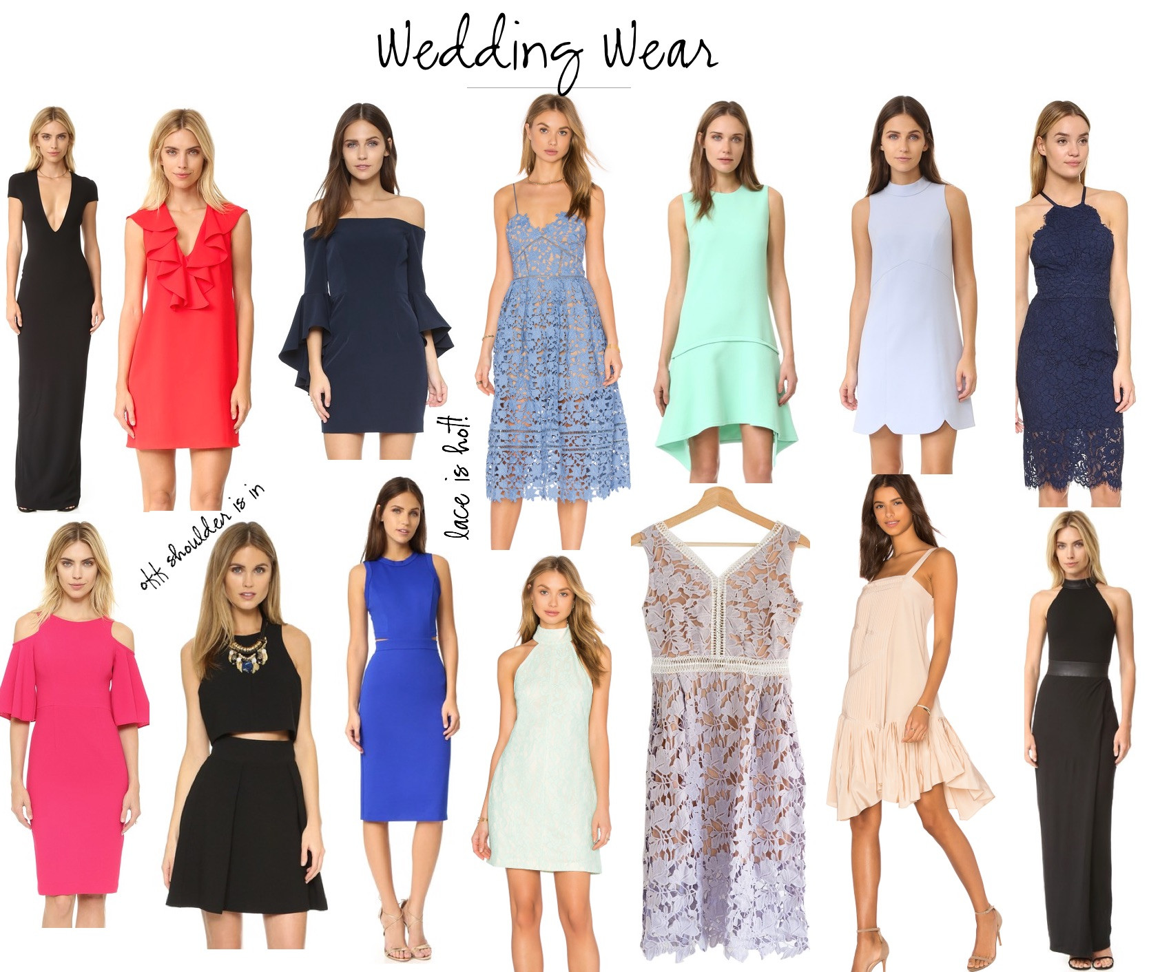 I am still loving everything off the shoulder, but I'm also obsessing over lace lately (like this one). I think lace makes for such an elegant and pretty dress to wear for a wedding. I love so many of the dresses below and even the touch of mid-riff or cut outs in the mid section. It makes for such a trendy option, but still sophisticated.